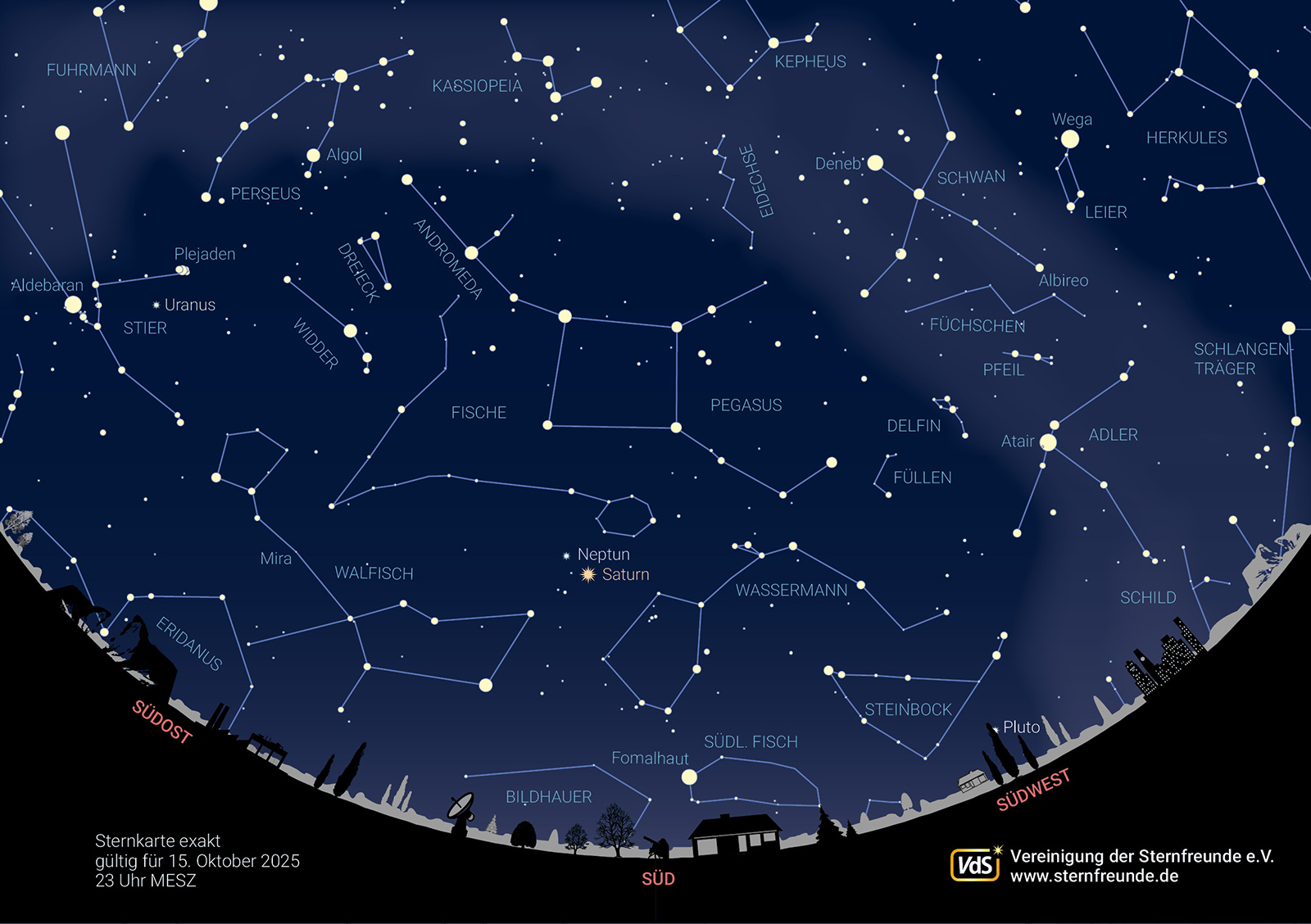 Im Oktober hat die Sonne den Himmelsäquator nach Süden hin überquert, daher sind die Nächte wieder länger als die Tage. Früh am Abend ist es am Himmel immer noch Sommer, was man gut am Sommerdreieck mit Wega in der Leier, Deneb im Schwan und Atair im Adler erkennen kann. Zu späterer Stunde – die Sternkarte gilt für 23 Uhr Sommerzeit – steht das große „Herbstviereck“ hoch am Himmel. Drei seiner Sterne gehören zum Sternbild Pegasus, die linke obere Ecke dagegen zur Lichterkette der Andromeda.