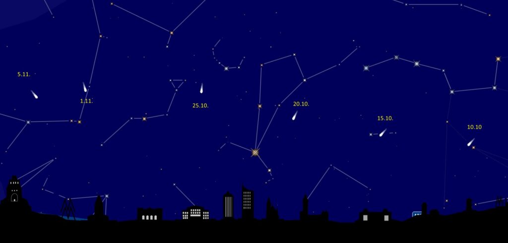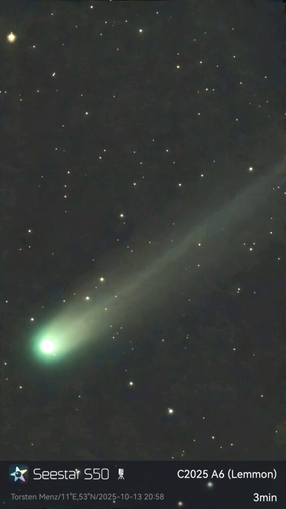Der Komet C/2025 A6 (Lemmon) hat die an ihn gestellten Erwartungen erfüllt und ist zu einem mit dem Fernglas sichtbaren Himmelsobjekt geworden. Für die Zeit von Mitte bis Ende Oktober kann man ihn nach Eintritt der Dunkelheit in nordwestlicher Richtung über dem Horizont beobachten. In dunkler Umgebung wird er dann sogar mit dem bloßen Auge zu erkennen sein.